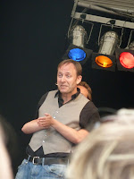 As I was headed home I came upon a trio of improv comedians on one of the stages and stopped to listen. They played the sorts of games I've heard in the States, getting suggestions from the audience, tagging in, and collecting sentences on pieces of paper. In one scene, they staged an "opera" about Curry 36, the famous Imbiss (quick snack shop) near my apartment; although it ended with the protagonist succumbing to "der Virus" [sic--EHEC is caused by the Salmonella bacterium], I may try to nab a currywurst there before I move. Below are photos I snapped of the guy in the vest promoting an open-air swinger club while the woman in the troupe stood behind him providing the gesticulations (and crotch readjustments). I also realize now that when they were discussing going to "the CSD" they weren't talking about the Christian Social Democrats but the gay parade! Even while understanding only 85-90% of what they were saying (or singing), I laughed so hard I got a headache and my cheeks hurt. Good times, Kreuzberg, good times! I'll miss you.