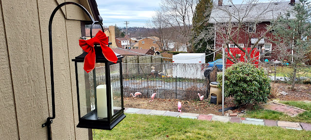 Since buying our house almost 2 years ago, we have been purchasing more Christmas decorations. Last year was a reusable wreath with matching garland for the light pole in the front, and a sparkly light-up deer for the back. This year I discovered "urn fillers" for the concrete containers on either side of the driveway and scoured the internet to find a set that DH liked with battery-operated timers that didn't require a second mortgage. (Our first picks cost $170! EACH!) I also leaned into some kind of country kitsch with two oversized black metal lanterns with battery-operated candles to hang in the back yard--for ambience? DH seems to like them.