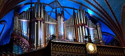 Then we walked to the Notre-Dame Basilica. It was built in the 1820 and the interior redecorated in the 1870s. Inside the brilliant blue ceiling stands out, but all of the walls are painted and gilded, and there are statuary everywhere, even Ezekial and Jeremiah carved into the base of the pulpit, which hasn't been used since Vatican II. Here's also a photo of the 1891 Casavant Freres organ for Dear Husband; has 7,000 pipes from 1/4 inch to 32 feet feet tall. It was quite dark inside, and we wondered how the congregation could have seen or appreciated all these details with sunlight through the few windows and then candle or gaslights. Now the cathedral hosts a music and light show in the evenings for twice what we paid to see the interior during the day.