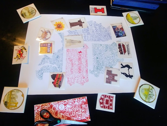 How many of us received Dr. Seuss's Oh, The Places You'll Go! as a graduation gift? I got mine after high school, I think. For graduation from residency, My Awesome Parents (MAP) gifted me a piece of personalized artwork with each state in which I got my education: Maryland (K-12), Missouri (BA), Illinois (MD PhD), and Pennsylvania (residency). Each state is made of words about the state written in a different primary color. So Maryland has crabs, Missouri has the Ozarks, Illinois has deep dish pizza, and Pennsylvania has the Liberty Bell. When I opened, I knew exactly what I wanted to do to personalize it further. I hopped on RedBubble and found transparent stickers with objects associated with each state. I actually ordered more than would fit so that I would have options; the leftovers will probably end up on travel mugs (then maybe I won't lose them as easily!). Below you can see the work in progress. For Maryland, a black-eyed Susan with the Maryland flag at the center and a crab with the state glad didn't make the cut; I chose the Old Bay spice box from McCormick's and a fancy, mosaic blue crab. I thought about fried ravioli or the Washington University in St. Louis seal but settled on the facade of Brookings Building (looks like a castle) and the silhouettes of two lindyhoppers. For Illinois, I left off the Block I for the University of Illinois in favor of the Alma Mater statue; and I put a painting of Louis Armstrong up in Lake Michigan for Chicago and the blues. And for Pennsylvania, I put a golden Cathedral of Learning for the University of Pittsburgh at the center and made the difficult decision to leave off the Mr. Rogers trolley in favor of the Duquesne incline, for reasons of space. Oh! And I ordered a "Made in Texas" QPC code, for obvious reasons. I was momentarily stymied when I discovered it was *exactly* the same size as the frame I picked up at Michael's, but a few trims with scissors cut it down to fit nicely. I'll hang the finished product either in our bedroom or, when I get one, my office.
